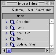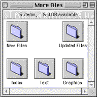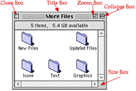 Here are the close, zoom, collapse, and size box accompanied with the title bar. The folder icons have been made 3D. Notice the old file spacing in the bottom three folders. A new wider spacing option is available.